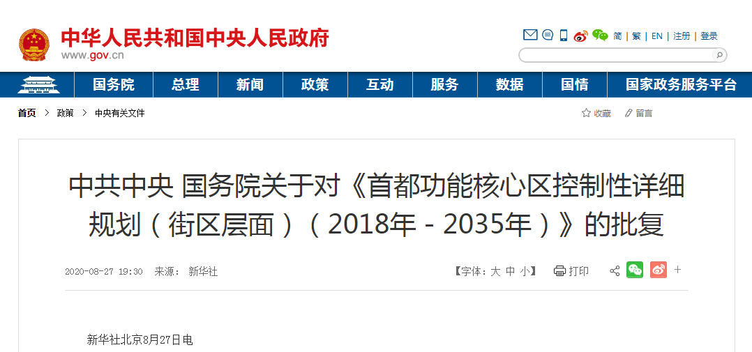 中共中央 国务院关于对《首都功能核心区控制性详细规划(街区层面)(2018年-2035年)》的批复