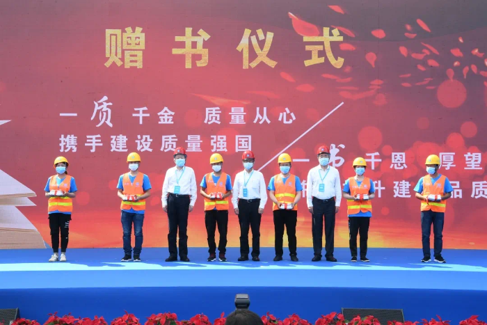 现场会宣读了质量终身责任制倡议书,倡议住房和城乡建设系统全体从业人员,弘扬工匠精神、勇担质量责任、塑造时代精品、打造中国质量。住房和城乡建设部副部长易军等与会领导同志向优秀质量安全管理班组代表赠送《工程质量通病防治手册》等书籍,观看项目现场建筑工人自编自导的质量安全、疫情防控宣传节目,并现场观摩工程质量常见问题防治、工程质量安全手册落实、工程质量提升等示范样板,切身体验智能监测、智慧建造数据中心、沉浸式BIM+VR功能模拟,工艺机器人等智慧建造内容。本次活动在中国建筑第八工程局有限公司施工的北京大学第一医院城南院区工程项目现场开展。
