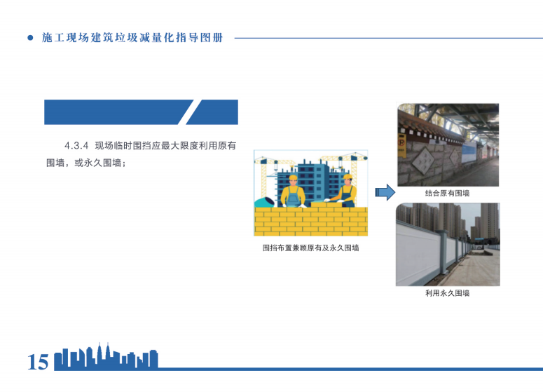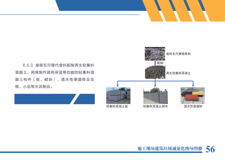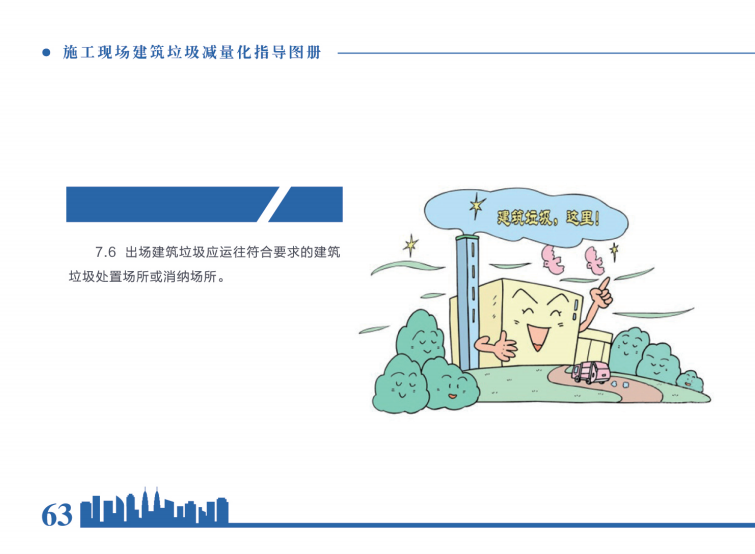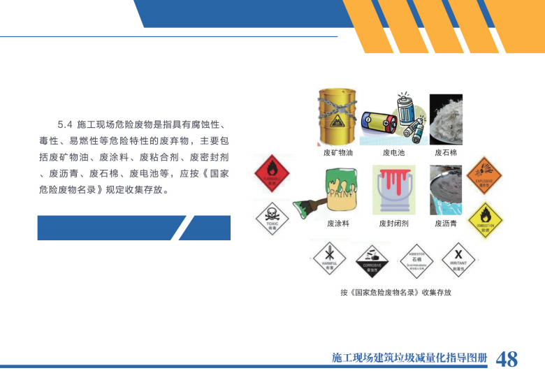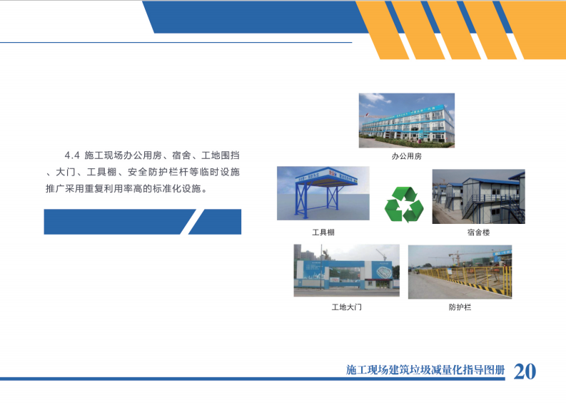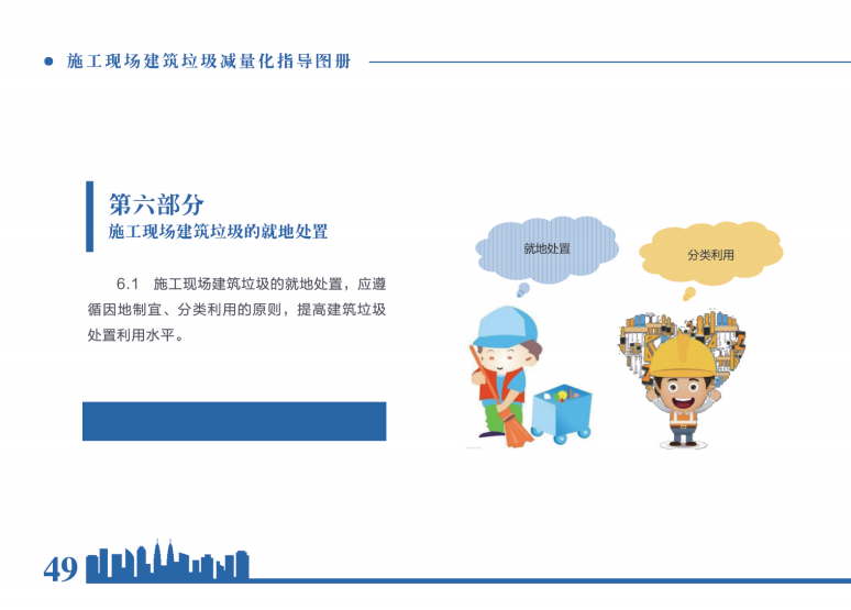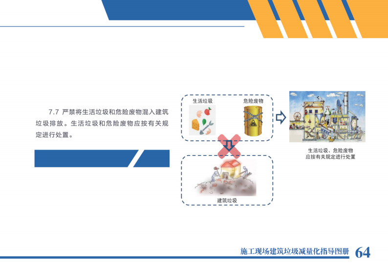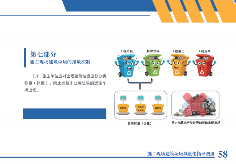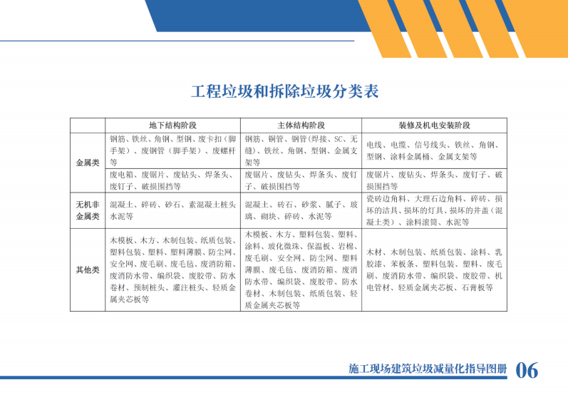 《施工现场建筑垃圾减量化指导图册》共有七个部分:总体要求、施工现场建筑垃圾减量化策划、施工现场建筑垃圾的分类、施工现场建筑垃圾的源头减量、施工现场建筑垃圾的分类收集与存放、施工现场建筑垃圾的就地处置、施工现场建筑垃圾的排放控制。《施工现场建筑垃圾减量化指导图册》适用于新建、改建、扩建房屋建筑和市政基础设施工程,对施工现场建筑垃圾减量化相关要求进行了图文并茂的展示。