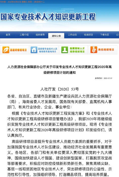 2020年5月14日,人力资源社会保障部办公厅印发《专业技术人才知识更新工程2020年高级研修项目计划的通知》(人社厅发〔2020〕53号),中国建设科技集团申报的“装配式建筑整体设计与生产施工一体化”高级研修班获批立项,研修经费由人力资源和社会保障部全额资助,中国建筑标准设计研究院为承办单位。