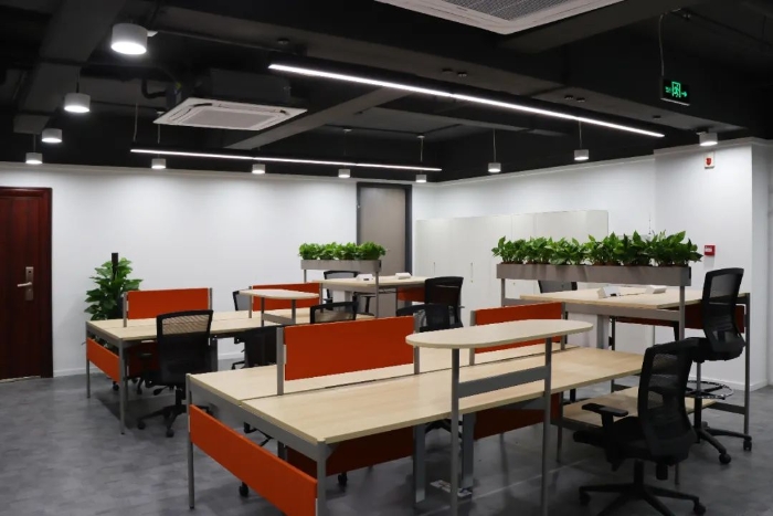 新改造后的校区分为面授教室、线上直播间、开放区工作坊、导播室、软件教学区、视频会议区、办公区等。斥资打造出可满足各类型直播、录播等线上培训需求的、可容纳70人进行线下培训的培训教室。