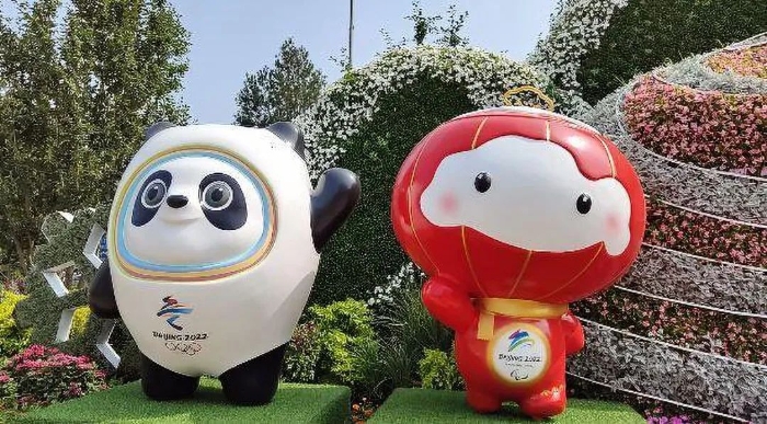 花坛以鸟巢(2008年北京奥运会)、冰丝带(2022年北京冬奥会)、世界地图为主景,配以冬奥会吉祥物以及我国举办或参与的重大国际活动标识(WTO、一带一路、北京 APEC、杭州 G20、金砖厦门会晤、博鳌亚洲论坛、中非合作论坛、上合组织峰会),体现在党的正确领导下,伟大的祖国阔步走向世界。