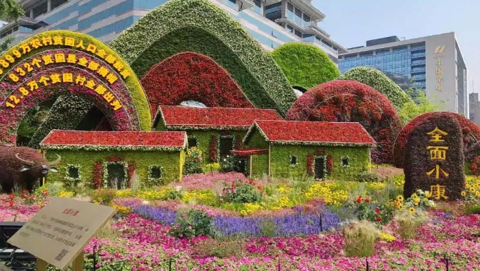 花坛以十八洞村旧貌换新颜的幸福生活为场景,体现在迎来中国共产党成立100周年的重要时刻,全面建成小康社会取得伟大历史性成就,决战脱贫攻坚取得决定性胜利。