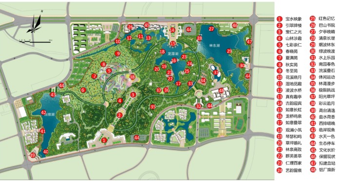 ▲崇仁森林公园景观设计项目:整体设计以“山水画卷,魅力崇仁”为设计理念。设计手法上以自然山水作为崇仁森林公园的自然基底,以崇仁理学作为崇仁森林公园的人文特色。总体布局形成一环、两轴、三湖、七片区的景观结构