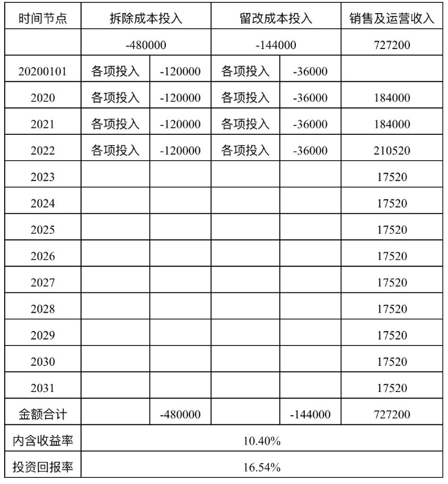 实际项目中的留改部分,有保留历史文化原貌建筑的,有老旧商业区改造,也有旧居民区改造等,留改部分要么是可直接提升后续运营收益,要不是可以带动提升周边商业设施运营收益,本文为简单起见,留改面积全部作为运营收入来源,则城投A公司改造完成后每年的运营收益分成为96*2*365*0.25=17520万元。
