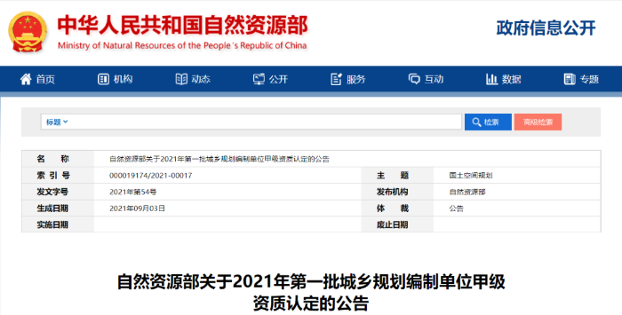 自然资源部关于2021年第一批城乡规划编制单位甲级资质认定的公告