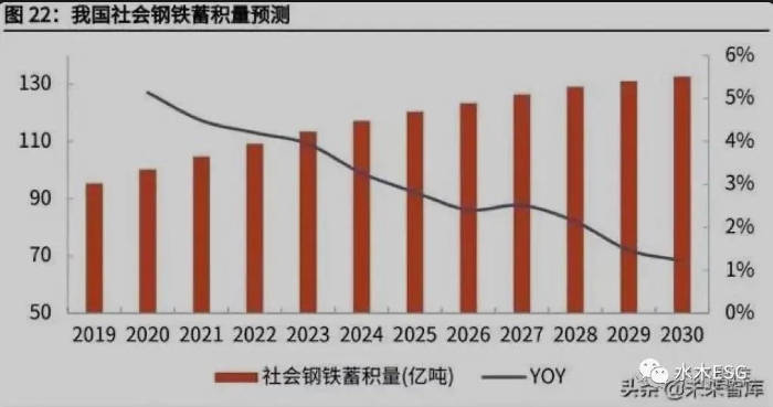 废钢的来源可分为折旧废钢(即日常生活里报废器材中含有的钢铁)、钢厂自产 废钢以及加工废钢。其中折旧废钢在废钢资源总量中所占的比例逐年增长,根据 中国工程院黑色金属矿产资源强国战略研究专题组的研究,折旧废钢可利用量可 以用社会钢铁蓄积量折算法得出,进而可以算出废钢资源总量。废钢产生率参考 美国、日本、俄罗斯等国的数据取 2.5%,2030 年社会钢铁蓄积量预测为 132.6 亿吨,折旧废钢占比以 80%计,回收率以 90%考虑,则 2030 年社会废钢可利 用量将达到约 3 亿吨。