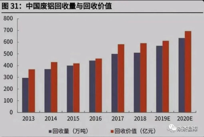 从再生资源回收结构上看,废钢、废有色金属(主要是废铝和废铜)、废纸、废 塑料等无论是在回收量(合计占比超过 90%)上还是回收价值(合计占比超过 95%)上,均位列前四。以下将就这四类可再生资源的循环使用进行重点分析, 其中废有色金属将以废铝为例。