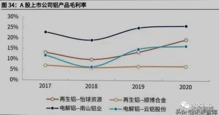 而通过比较 A 股上市的电解铝和再生铝制造企业具体到产品的毛利率,原铝企 业的表现也整体更好,如作为原铝制造龙头之一的云铝股份在铝锭上的毛利率高 出顺博合金 10 个百分点(2020 年数据)。
