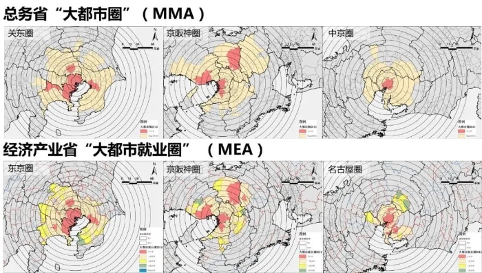 在现实中,日本政府机构及学界有两套圈域表达方式。一套是用以反映现实状况的统计“都市圈”,多以通勤、通学比率作为测度中心-外围联系紧密程度的核心指标,其中以总务省的“大都市圈”(MMA,1.5%通勤通学圈)和经济产业省的“大都市就业圈”(MEA,10%多级迭代通勤圈)测度标准应用最广。此外国土交通省还曾采用“功能性城市区域”(FUR)的定义和标准。(表2、图2)
