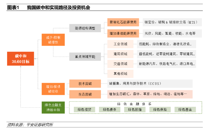 中国作为目前全球碳排放量最高的国家,要实现“30·60目标”还有很长的路要走。平安研究认为要实现这个可量化的约束指标,有三大实现路径。在实现这一目标过程中将催生八大领域的投资机会,特摘录分享如下,供参考: