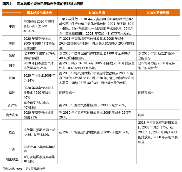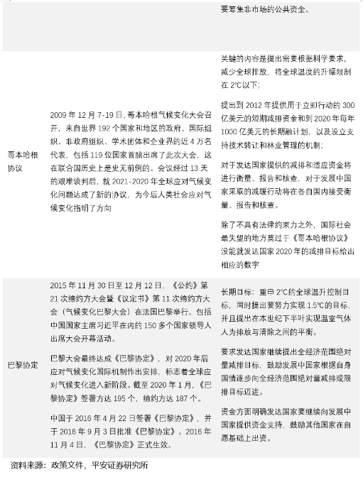 −《哥本哈根协议》。在《京都议定书》第一承诺期即将到期的背景下,2009年12月7-19日,哥本哈根气候变化大会召开,并在13天的艰难谈判后,就2021-2020年全球应对气候变化问题达成了《哥本哈根协议》,提出根据科学要求,需通过减少全球排放将全球温度的升幅限制在2℃以下;同时提出了全球减排所需的资金安排,及不同国家的减排任务。但是,《哥本哈根协议》并不具法律约束力,且并未给出发达国家2020年的具体减排目标。