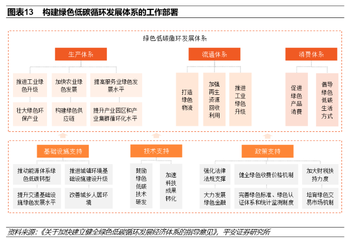 《指导意见》从两大方面入手,部署了六项重点任务。一方面,构建绿色低碳循环发展体系,包括生产、流通、消费三项重点;另一方面,提供绿色低碳循环发展的外围支持,包括基础设施、技术、政策三个角度。《指导意见》要求以节能环保、清洁生产、清洁能源等为重点率先突破,做好与农业、制造业、服务业和信息技术的融合发展,全面带动一二三产业和基础设施绿色升级。
