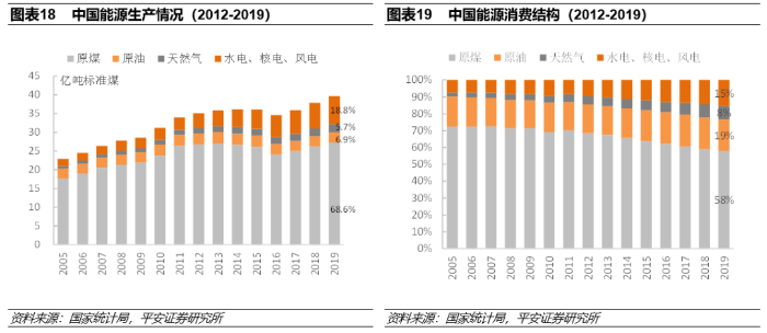能源结构调整是实现碳中和目标最重要的手段之一。根据国家统计局公布的数据,中国的能源结构目前仍然以化石能源为主。从能源生产看,截至2019年,原煤、原油、天然气等化石能源生产量占能源生产总量的比重超过80%,而水电、核电、风电等清洁的非化石能源占比不到20%。但从能源消费结构的变化趋势看,非化石能源消费占比近年来持续增长,到2019年占比升至15.3%,已提前完成到2020年非化石能源消费比重达到15%左右的目标。