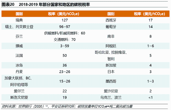碳税是通过税收手段,将因二氧化碳排放带来的环境成本转化为生产经营成本 。据世行统计,截至2020年6月,已有超过30个国家和地区实施了碳税政策,覆盖二氧化碳排放总量达300亿吨。此外,在已制定国家自主贡献的185个《巴黎协定》缔约方中,已有97个缔约方提出正在计划使用或考虑使用碳税、碳排放权交易履行国家自主贡献承诺。