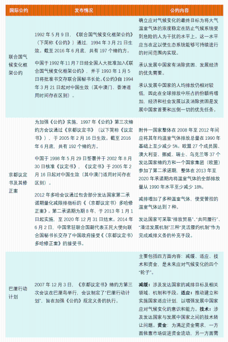−《联合国气候变化框架公约》。1990年12月,第45届联合国大会决定制定《联合国气候变化框架公约》(下称《公约》);《公约》于1991年2月正式启动谈判,历经五轮谈判后于1992年5月9日通过,规定了发达国家与发展中国家的温室气体排放水平,以及他们为应对气候变化所承担的义务,包括提供资金、技术援助,以及实施的支持政策和行动。