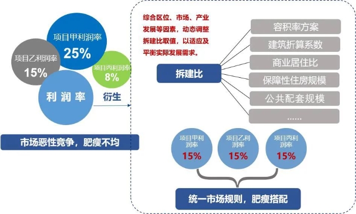 构建以“净拆建比”为核心、多指标协调的利益统筹规则,统筹各单元的预期收益。所谓“净拆建比”,是指项目商品性建筑面积(含小型配套商业,不含配套公共服务设施、配建保障房等)与拆除范围内现状建筑面积的比值。基于“少拆少建、多拆多建、权责平衡”思路,构建经济测算模型,以项目成本利润率15%为目标,保障项目经济可行和市场公平。