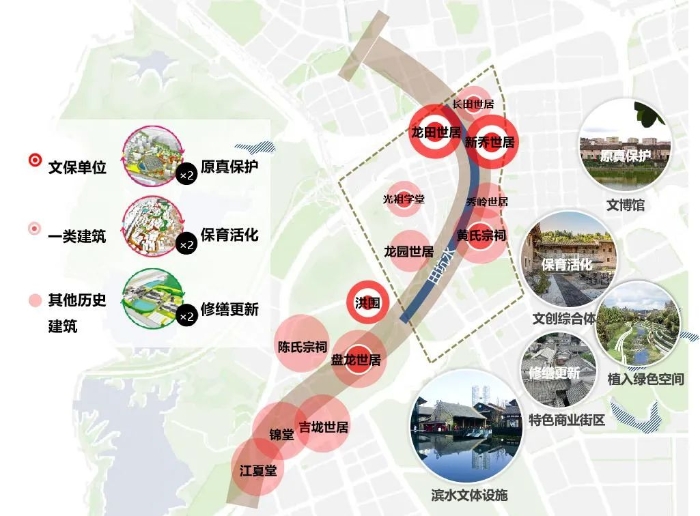 通过空间统筹系统构筑历史人文生态特质的空间格局,依据历史建筑保护级别及要求,区别活化使用原则与策略。在政府、市场共同协商下,确立市场主体开发活动中的文物保护责任。坑梓案例片区内新乔世居、龙田世居等重要文物得以保护,保留活化历史建筑方案获得市场主体与城市更新主管部门认同。