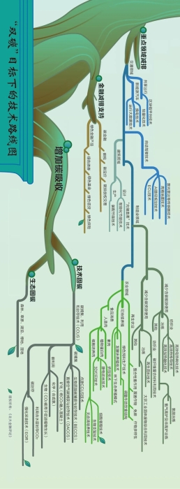 近日,《北大金融评论》发布“双碳”目标下的技术路线图,包括减少碳排放和增加碳吸收2条主路线。其中,减少碳排放包括能源结构调整、重点领域减排和金融减排支持3条路线,增加碳吸收又包括技术固碳和生态固碳2条路线。如此逐级细化,得到完整技术路线图(该图不代表本公众号观点)。