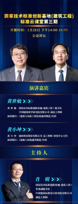 国家技术标准创新基地(建筑工程)标准云课堂第三期线上讲座活动将于1月28日14:00开播,本期活动特邀全文强制性标准主编详细解读《建筑与市政工程抗震通用规范》和《混凝土结构通用规范》,敬请观看!