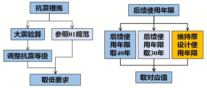 步骤:确定地震作用取值→确定抗震措施→确定后续工作年限。(注意顺序上的差别)
