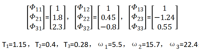 下面我们来计算上面三自由度体系的地震内力。前面我们已经求出振型、频率如下: