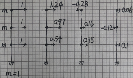 至此我们就求出了各振型在每个质点上的地震力分布(即任一时刻地震力大小的相对值),分布形式与振型的形状相同,如下图所示: