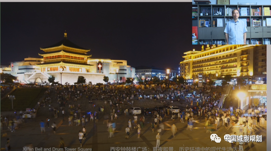 下图是西安钟鼓楼广场,夏天的夜晚有很多人在这里聚集活动,也有些文艺表演,这些构成了城市丰富的活力场景,这与“以人为本”有很大关系。
