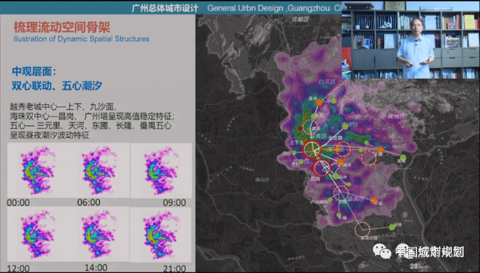 我们在做广州总体城市设计的时候对市域范围的手机信令LBS数据进行捕捉,可以看到城市中时间不同切片上潮汐流动的现象,包括逗留锚定的区域、热点区域等都能够划定识别出来。