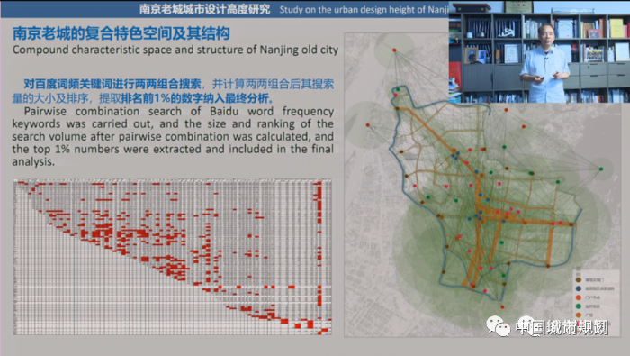 在南京老城城市设计高度研究中,我们对百度词频关键词进行两两组合搜索,并计算两两组合后其搜索量的大小及排序,提取排名前1%的数字纳入最终分析,由此对公众的南京兴趣资源景观点有了整体认知,画出了下图右侧的老城图,揭示出南京老城兴趣点的空间结构。