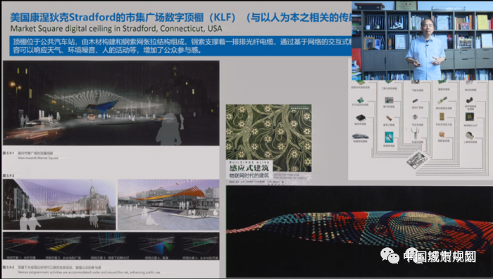 现在有人用传感器的方式进行人机互动的建筑和构筑物的设计。下图是美国康涅狄克Stradford的市集广场数字顶棚(KLF),其中使用了大量传感器技术。