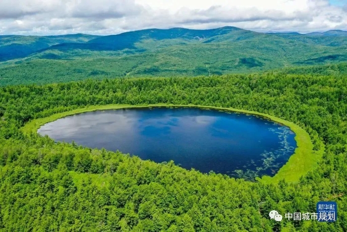这是内蒙古阿尔山国家森林公园内的天池(2021年7月14日摄,无人机照片)。新华社记者 连振 摄