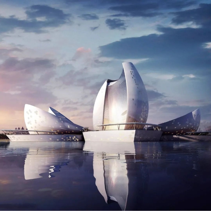 该项目是一个公共建筑群,包括海洋博物馆、海洋生物多样性研究中心、海上会议中心和岸堤公园,以期宣传海洋文明和保护海洋生物。采用“海上花”的设计理念,使堤岸、沙滩、岛礁、大海、公园、广场、平台、建筑多种元素浑然一体。主体建筑以海洋博物馆主馆高耸的“海螺”为重心,博物馆副馆、研究中心和海上会议厅3个建筑取相似的“贝壳”形态,围绕在主馆周围。这些海螺贝壳时而聚合,时而开放,犹如水上莲花含苞待放。