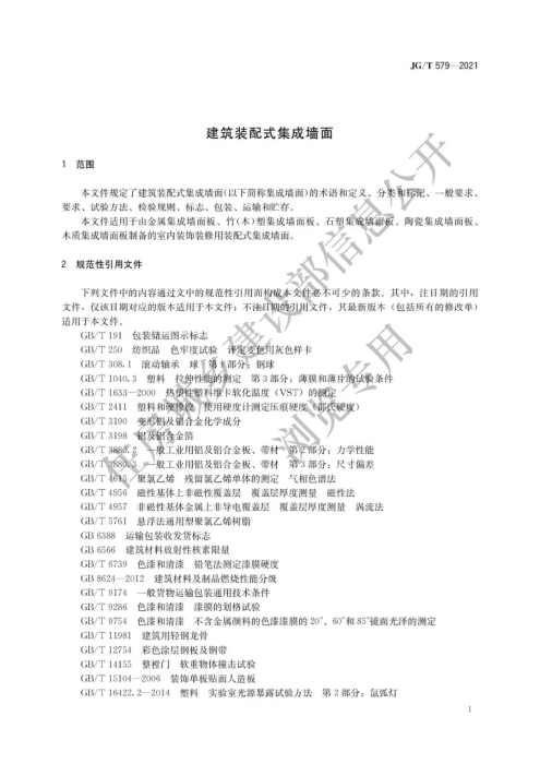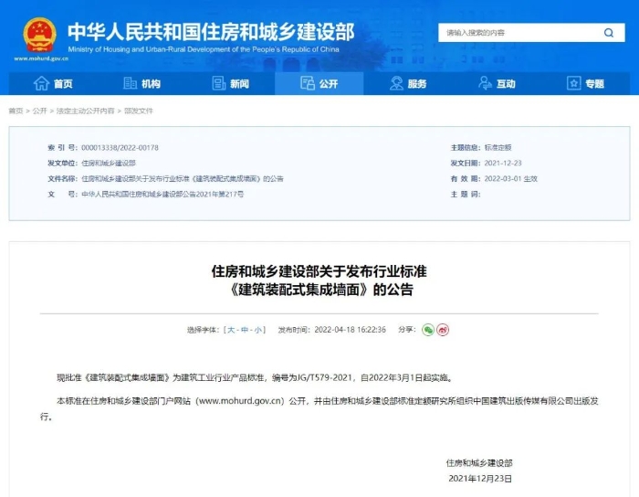 4月18日,住房和城乡建设部官网发布通知,现批准《建筑装配式集成墙面》为建筑工业行业产品标准,编号为JG/T579-2021,自2022年3月1日起实施。