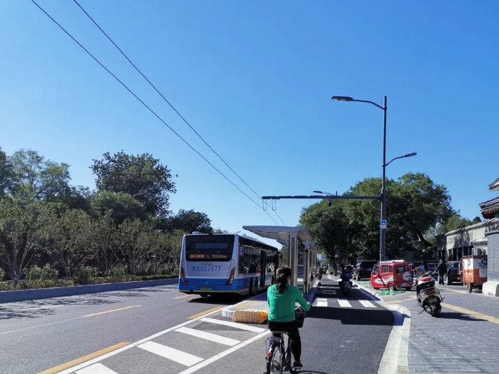 地安门西大街北侧,有一段沿街四合院的标高比街道高出1米多,这里是平安大街路板最窄的一段。设计团队仔细地梳理了边界条件,利用压缩车道释放出的有限空间,把人行道调整至街道标高上,让通行更便捷,台上空间整理电箱和灯杆使其更合乎居民的生活需求,整理后的高台区成为传统四合院与城市道路之间的缓冲带。