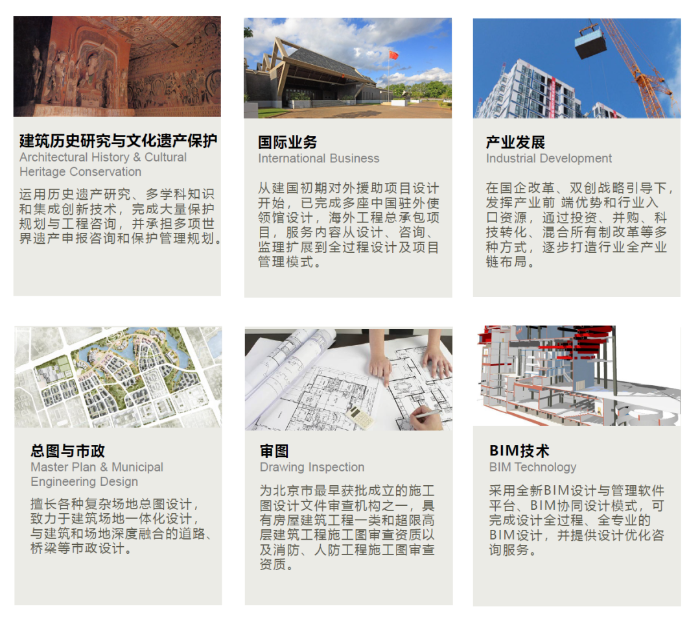 目前,中国院已基本形成集设计、科研、建设于一体的集团化产业构架,包括建筑工程设计与咨询、城镇规划与城市设计、EPC工程总承包与咨询、建筑历史研究与文化遗产保护、风景园林与景观规划、科研与技术转化等6大业务板块。