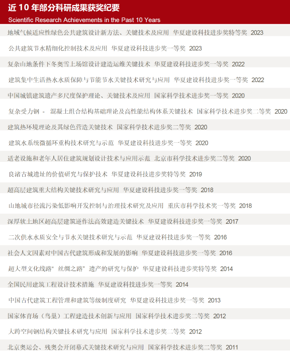 在70余年的发展历程中,中国院已先后在我国各省、直辖市、自治区及海外近60个国家和地区完成各类建筑设计项目万余项,自1978年至今累计获得各类国际、国家及省部级设计奖项1000余项。目前已成为国内建筑设计行业中影响力较大、技术能力较强、专业人才汇聚、市场占有率较高的领军型设计企业。