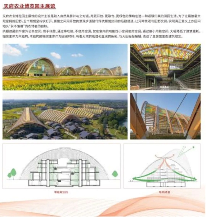 中国院的展览内容充分体现了中国工程院院士、中国建科首席科学家、中国院总建筑师崔愷的 “绿色设计新美学”核心理念。“少人工、多天然,适宜技术的应用是最应推广的节能环保”——成都天府农业博览园主展馆的半室外公共空间采用自然通风和采光,仅在室内的功能性小空间使用空调,通过缩小用能空间大幅降低了建筑能耗。