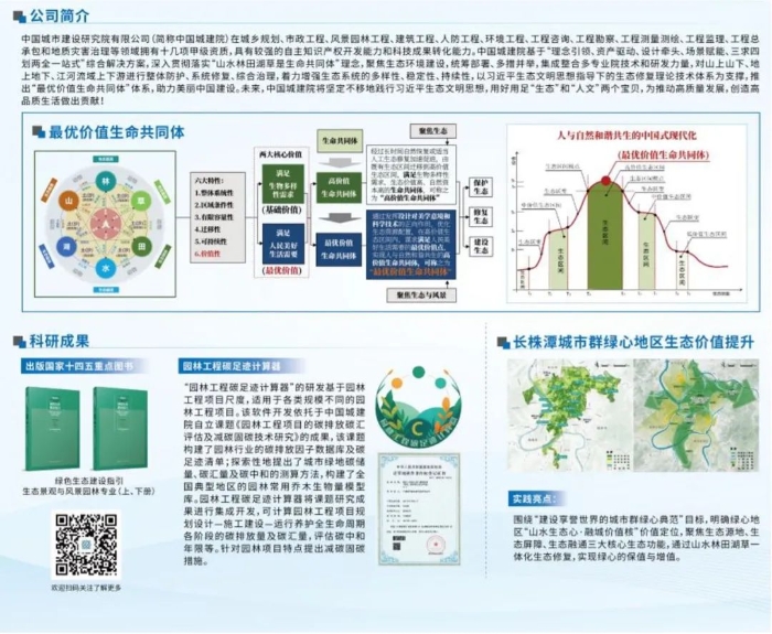 中国城建院以习近平生态文明思想为指导,坚持节约优先、保护优先、以自然恢复为主的方针,通过聚焦生态、聚焦风景、基于自然和人文的解决方案,系统开展山水林田湖草一体化保护和修复,凝练形成最优价值生命共同体理论,集成创新生态领域成套、低成本的技术、产品、材料、工法,融合生态设施、绿色建筑,精心打造“长江风景眼、重庆生态岛”,建成生动表达山水林田湖草生命共同体理念的生态大课堂。