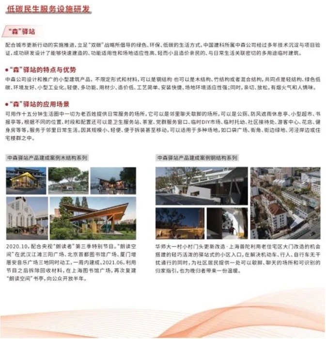 中森公司专注于低碳建筑技术的研究与应用,展出最新低碳产品研发成果、零碳技术设计案例以及低碳住区课题研究。中森公司秉承绿色、环保、低碳的生活方式,经过多年技术积累和项目实践,成功研发并设计出一种多用途临时建筑。这种建筑具备快速建造的特点,功能适用性和场地适应性极高;轻巧且成本可控,与人们的日常生活紧密相连;不受形式和材料的限制,既可以是钢结构,也可以是木结构、竹结构或混合结构;绿色低碳、环境友好,并且实现了小型工业化生产。